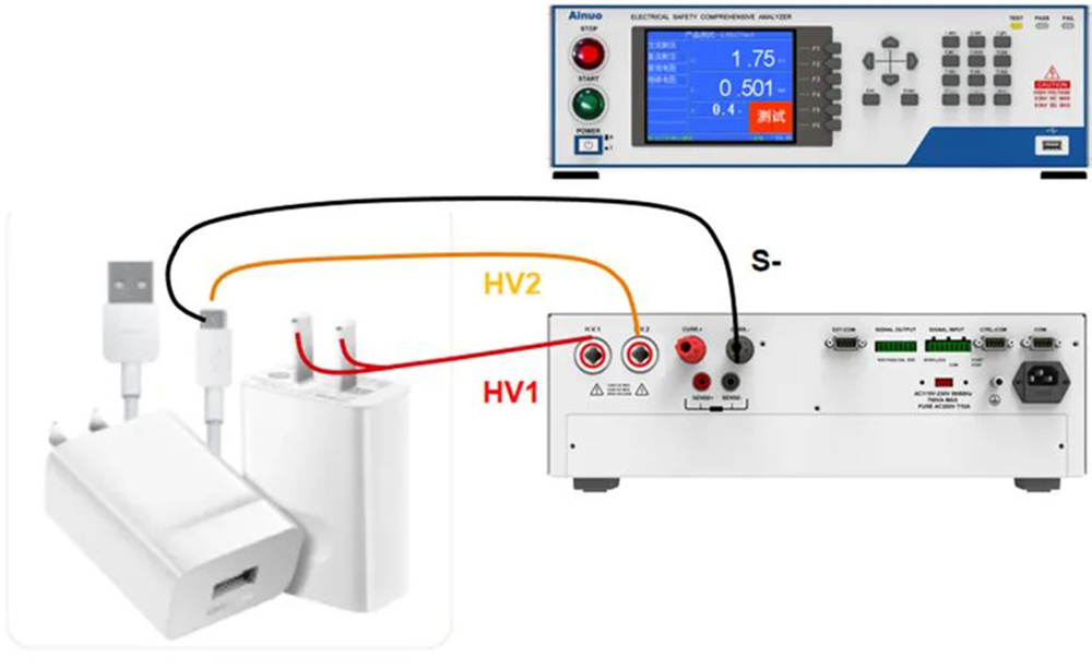 1)HV1(正高压)--- C-/S-(0V),输入L/N---PE之间耐压U1测试,1s;