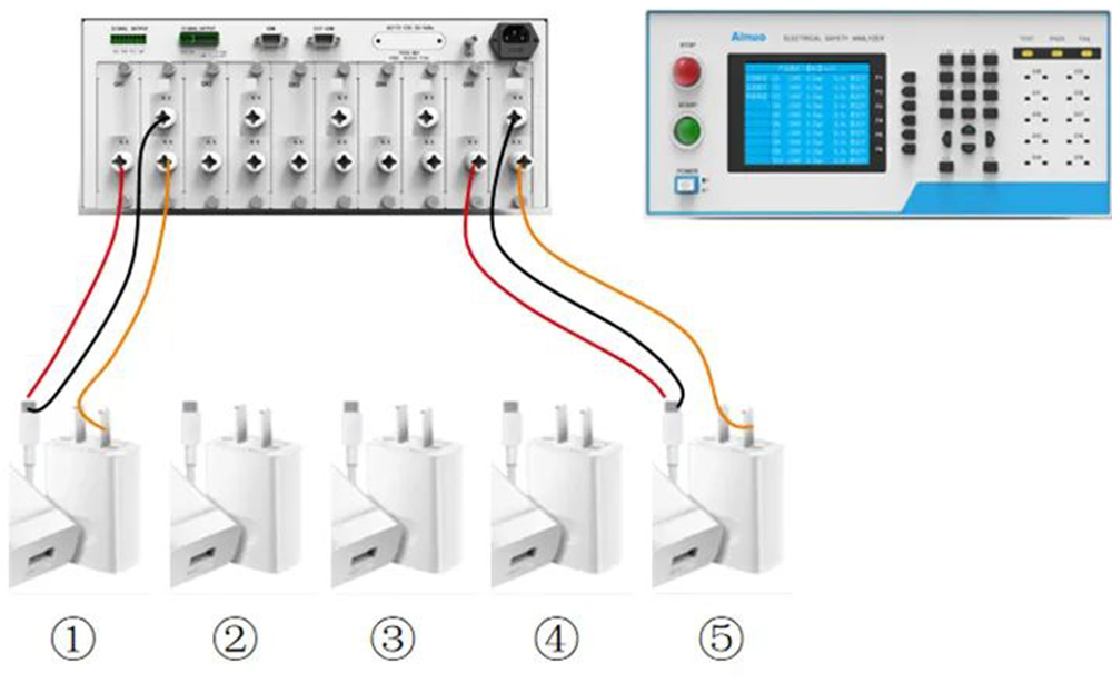 ■ AN9633H-5多通道并行安规测试仪,内置5个可独立参数设置和同步并行测试的耐压绝缘测试模组,每个模组具备3路可编程高压切换通道,可自动完成开关电源的输入端、输出端、机壳的任意两点之间的耐压绝缘测试。测试流程步骤如下: