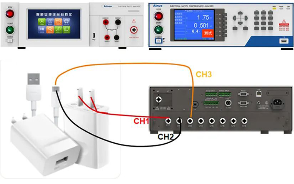 1)CH1(高压)---CH2(低),输入L/N---PE之间的耐压测试,1s;